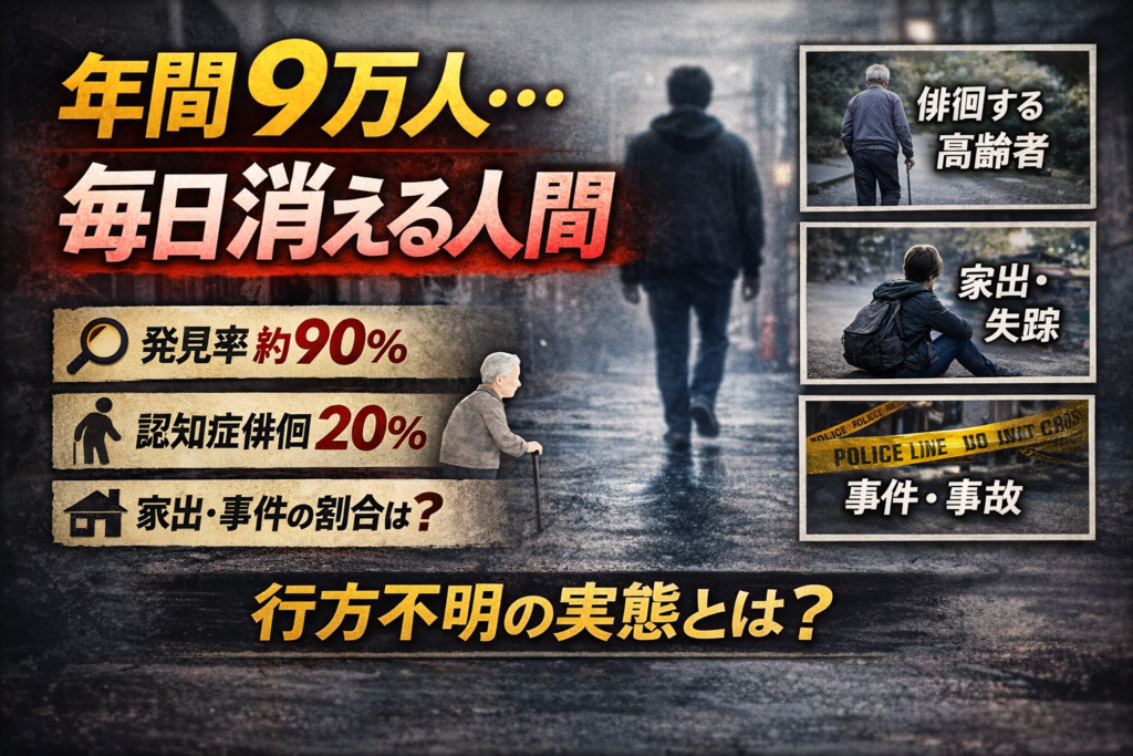 — 行方不明者の実態を統計から読み解く —毎年、驚くほど多くの人が「忽然と」姿を消しています。警察庁が毎年公表している統計を見ると、年間8万〜9万人前後の「行方不明者届」が受理されており、1日あたりに換算すると200〜250人以上が行方不明…